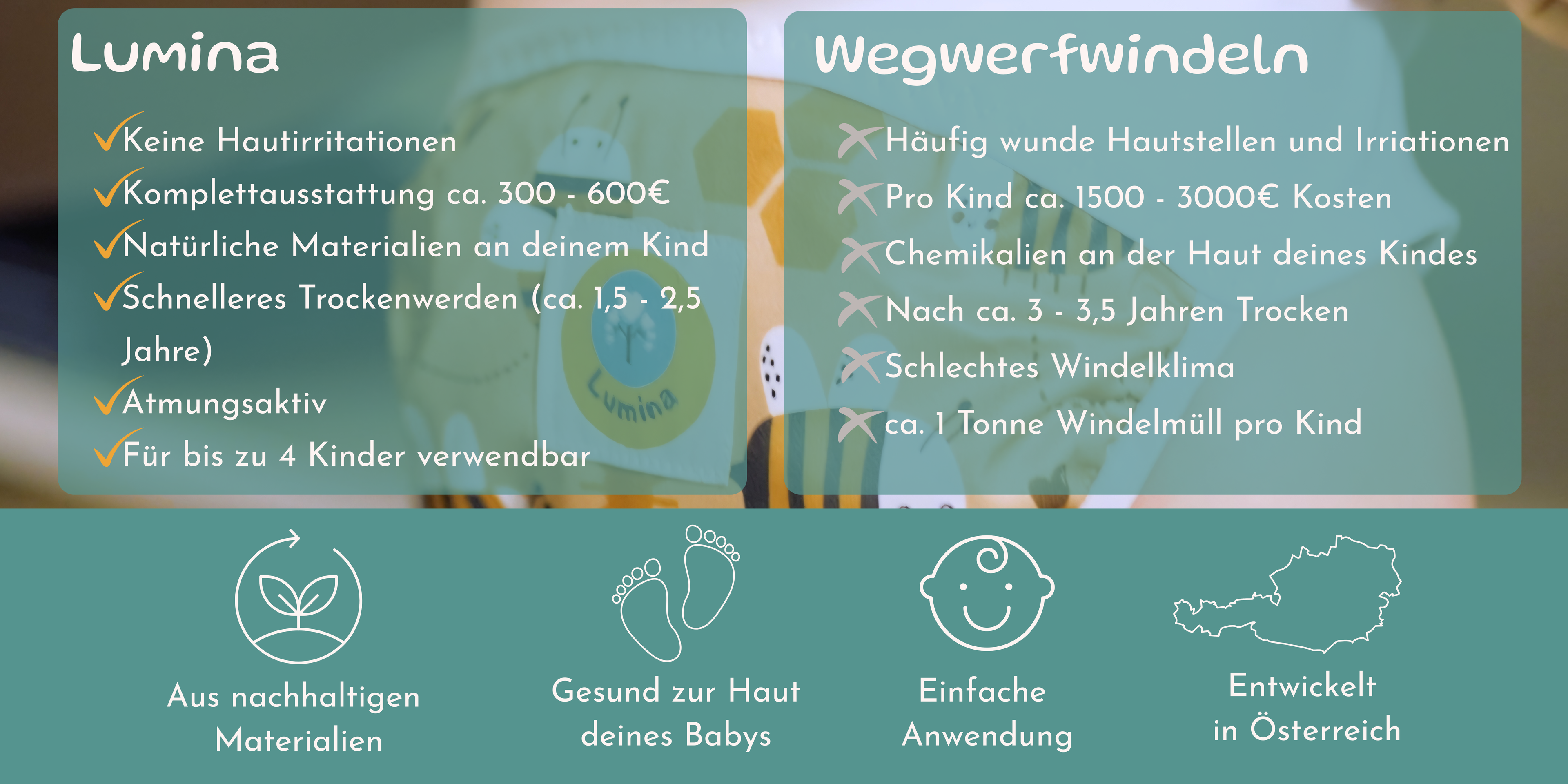 Durch die Freundschaft hatte ich das Glück, verschiedenste Marken und Systeme durchzutesten und daraus entstand die Marke LUMINA. Ich habe das beste der Stoffwindelwelt und der verschiedensten Marken zusammengefasst und daraus unsere Windeln entwickelt. Mit der Unterstützung von Kund*Innen und Tester*Innen entstand dann unser Produktsortiment.